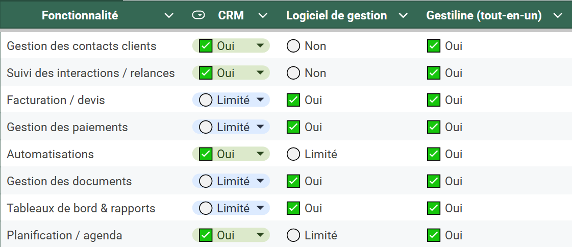 En résumé : le logiciel de gestion se concentre sur l’organisation, l’administration et les finances, pas sur vos interactions clients.